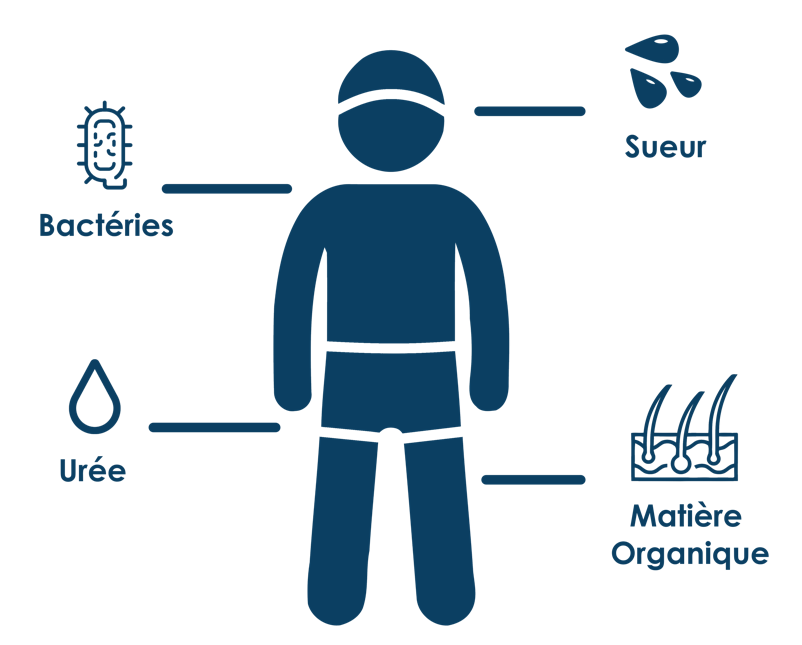 Les chloramines sont produites par la réaction entre le chlore et les matières organiques présentes dans l’eau comme la sueur, les restes de cosmétique, la salive, l’urine ou les peaux mortes provenant des baigneurs. Ce sont elles qui sont à l’origine de l’odeur de chlore très désagréable et donne cette sensation d’irritation des yeux. Les chloramines sont également responsables de maladies respiratoires chez les maîtres-nageurs.